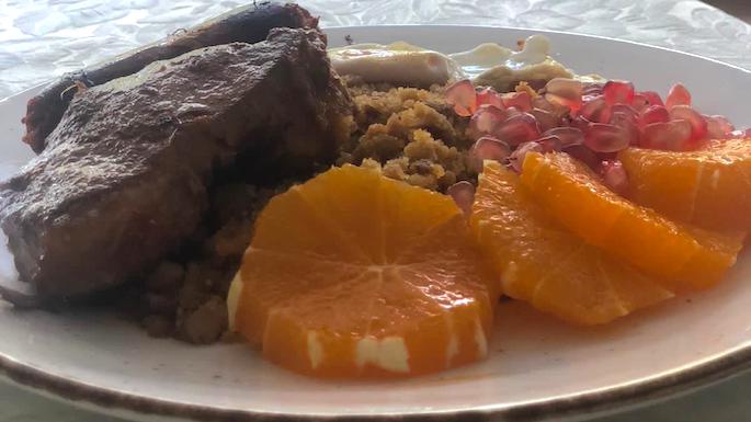 A la mesa le llegan de dos formas: la versión de ‘migas completas’ o las ‘migas simples’. Estas últimas solo se sirven con un poco de melón, aceitunas y naranja. “No son tan gansas como las completas”, dice entre risas. Estas llevan “lomo, pimiento frito, melón, aceituna, chorizo y morcilla”.
