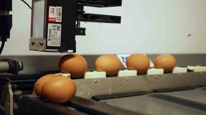 Vemos cómo se envasan uno a uno, como se van completando los estuches con diferentes tallas de huevo, de la S a la XL, y se les imprime el código que es lo que hay que tener en cuenta a la hora de comprar este tipo de productos para saber algo más de su origen. La nomenclatura que se puede ver en la cáscara se traduce de la siguiente manera: 0 –huevo ecológico– ES –de producción española– 29 –de Málaga– 42 –referente a Coín– 509 –Río Grande. Le sigue la fecha de consumo preferente.