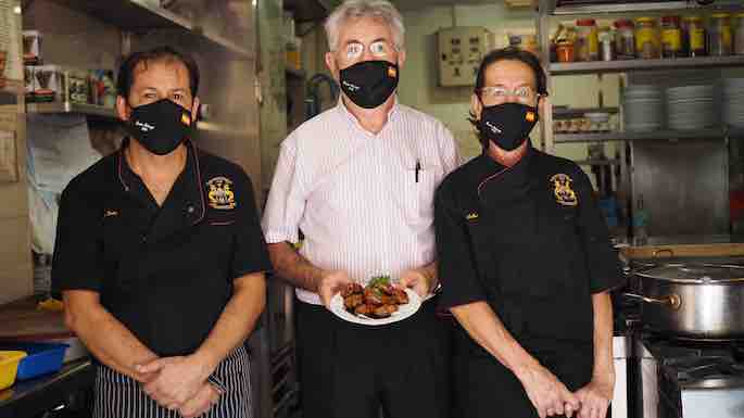 Entramos en faena y vamos hasta la cocina, donde nos espera Jesús, jefe de cocina del mesón, y Rafi, hermana de Pepe y de Manolo, el otro fundador del restaurante (ya retirado). Ellos se ocupan de prepararlo todo, prender el fuego y darle movimiento a esos fogones. Nos dan unas orientaciones sobre qué se necesita para preparar unas berenjenas que se le parezcan algo a las que se sirven aquí: berenjenas, un diente de ajo, medio vaso de cerveza, medio vaso de agua, una cucharada y media de harina de repostería, una cucharada pequeña de levadura y un poco de sal, pimienta y perejil, para rematar.