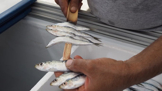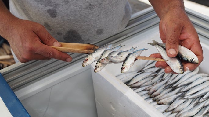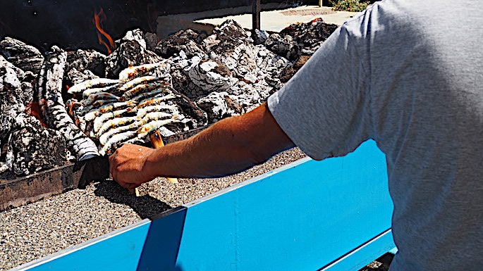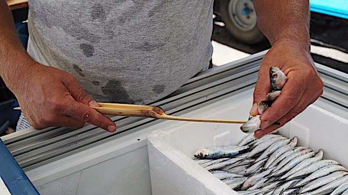 ¿Las claves? Sin lugar a duda la pericia a la hora de espetar el pescado, que no solo de sardinas ‘se alimentan’ las cuentas del local. También espetan voraces, pargos, jureles, urtas y calamares, entre otras especies. “Trabajamos con una pescadería de confianza del Rincón y según lo que haya fresco del día así ofrecemos una u otra cosa a los clientes”, continúa Julio. Mientras charlamos va colocando la madera de olivo en el carro que le hace las veces de barca espetera. Está todo listo y va prendiendo la llama para ir preparando esas brasas y ese calor que dejará en su punto las sardinas del chiringuito.