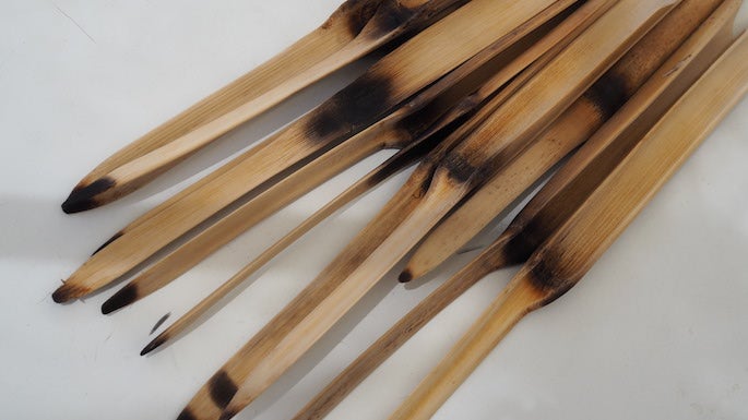 La jornada va marchando según lo previsto y Julio tiene a mano prácticamente todo lo que va a ir necesitando. La madera para ir reponiendo –“de olivo siempre, porque es muy fácil encontrarla aquí, es común en Andalucía, y además tarda bastante en quemarse, ofrece mucha resistencia, y eso es una ayuda para los que estamos frente al fuego”–, unos cubos de agua –para ir refrescándose las manos y no quemarse al ir cambiando de lado los espetos y cuando toca sacarlos para servir–, la sal, los platos y el limón, que se suele poner siempre para aquellos que disfrutan dándole este toque último antes de comerse la sardina. Ah, y las cañas ya hechas espetos, por supuesto, que Julio aprendió a hacerlas de su padre y ahora se ocupa él. Antes de que comiencen las prisas y vayan llegando las comandas con espetos de sardinas, él ha preparado un buen número de piezas para que tal cual le llegue la orden de los camareros vayan poniéndose a la brasa y de aquí a la mesa.
