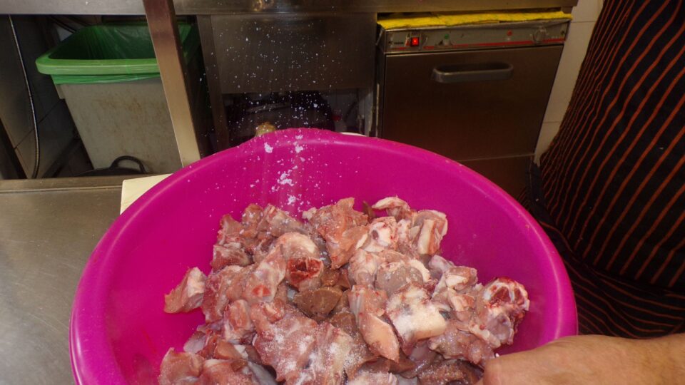 Jacinto corta la carne y separa las costillas para hacerlas a la plancha: “La asadura blanca la tiro, solo dejo el hígado” Una vez cortado, Jacinto calienta una olla con aceite verdial, un producto que elabora él mismo: “El aceite lo hacemos nosotros, es de nuestro campo”, asegura.