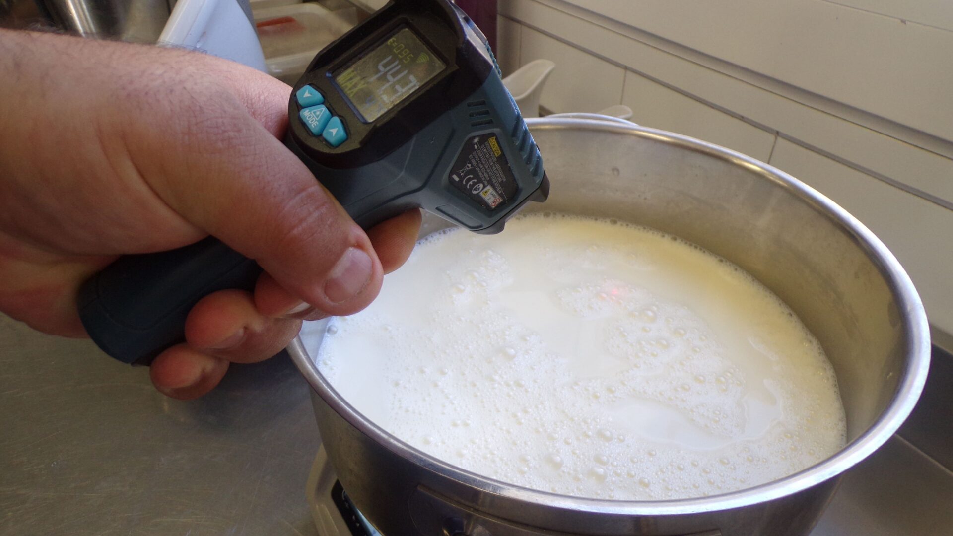 Una vez en los fogones, Milos no deja de remover la mezcla para que no se pegue y a la par va comprobando la temperatura con un termómetro hasta obtener los 80 grados: “Este paso es súper importante”, recalca.