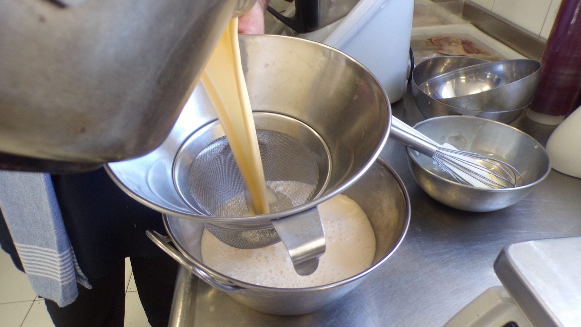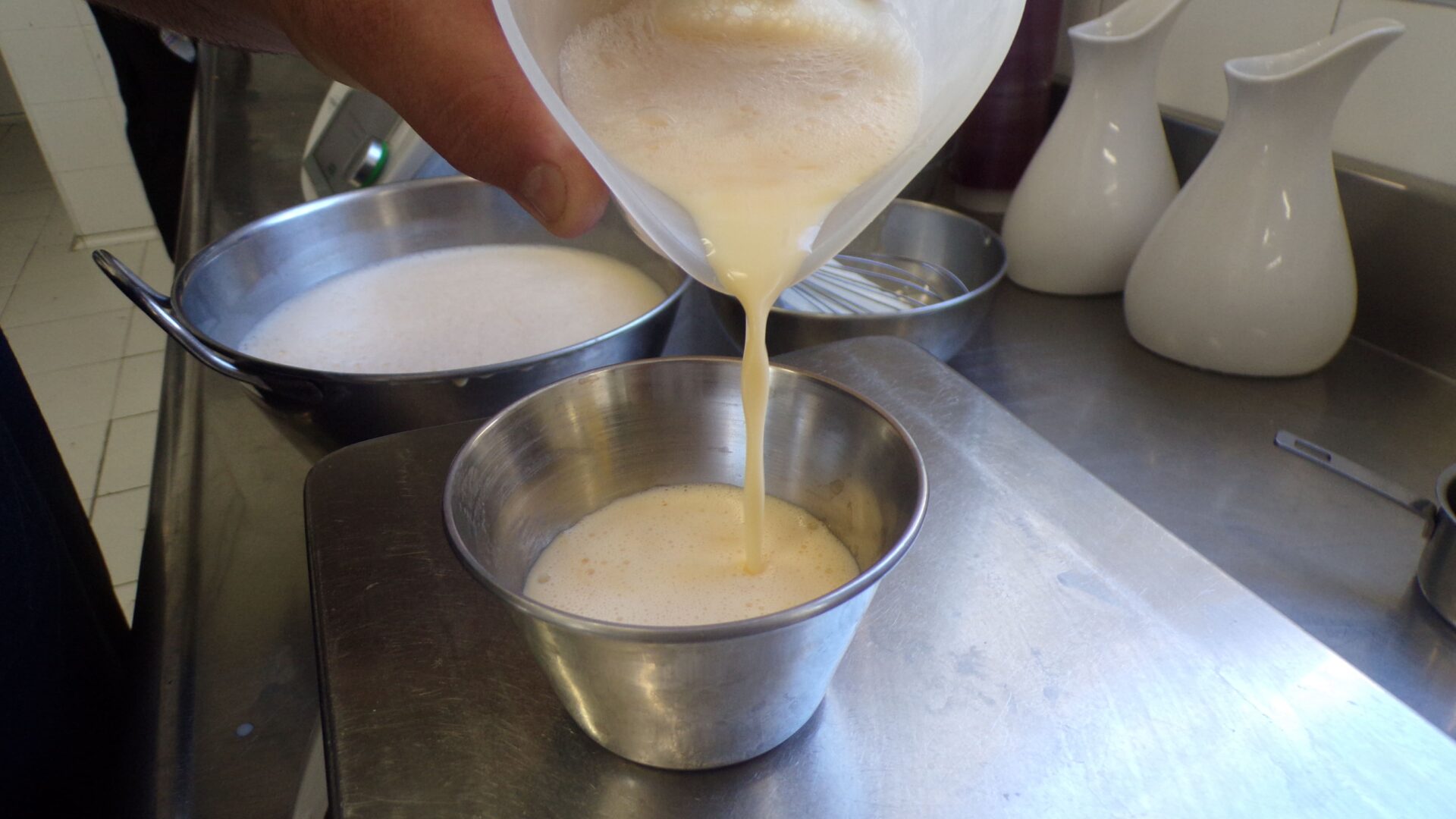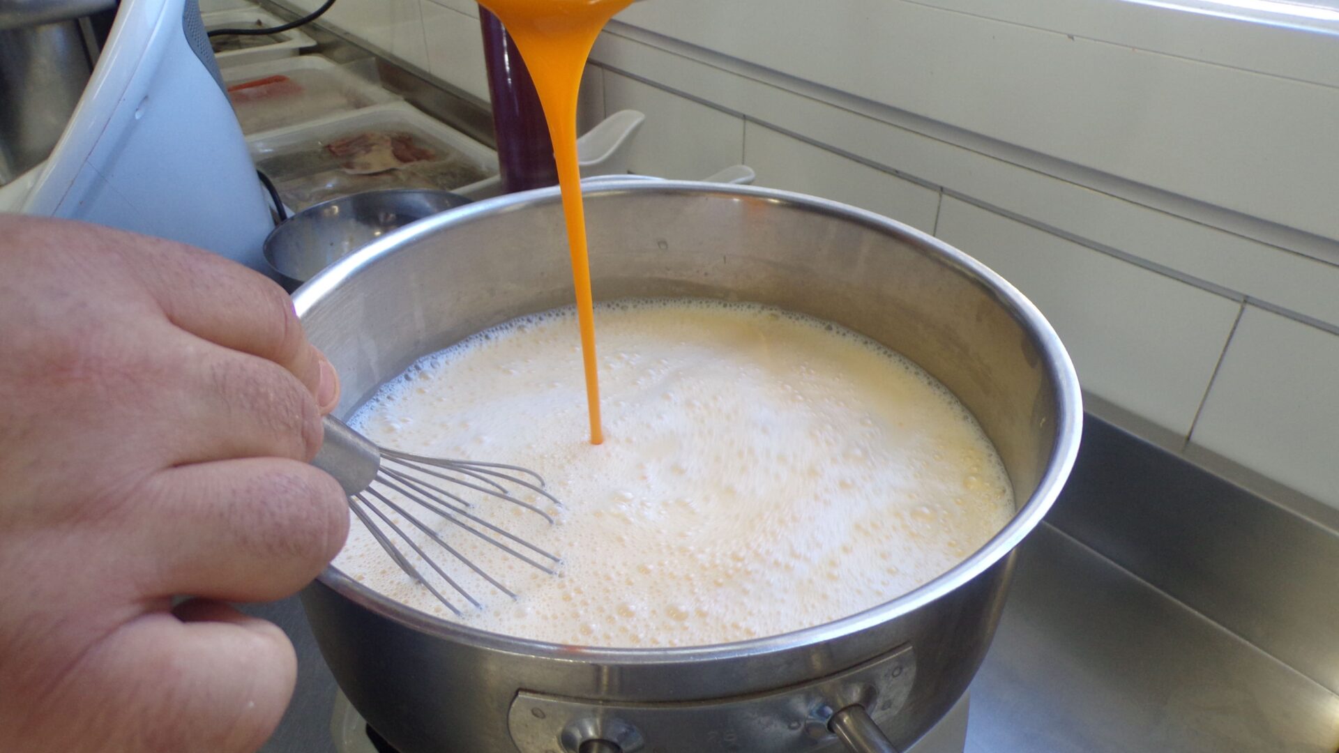 Una vez la mezcla está en la temperatura deseada, Milos comienza echa el resto de los ingredientes: el huevo, la yema y la leche condensada : “Mezclado todo, reservamos la masa. Yo la suelo colar por cualquier cosa y la dejamos reposar un mínimo de 12 horas o un día. Todo este proceso se puede llevar a la thermomix, pero aquí lo hacemos de la manera tradicional porque nos gusta así”, aclara.