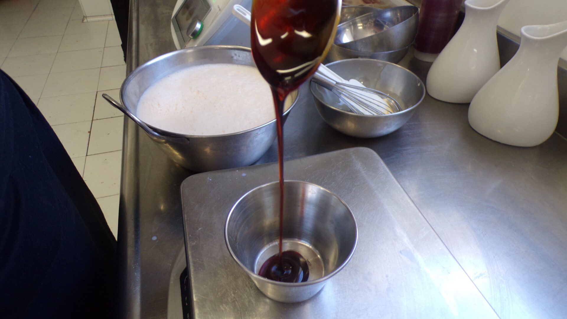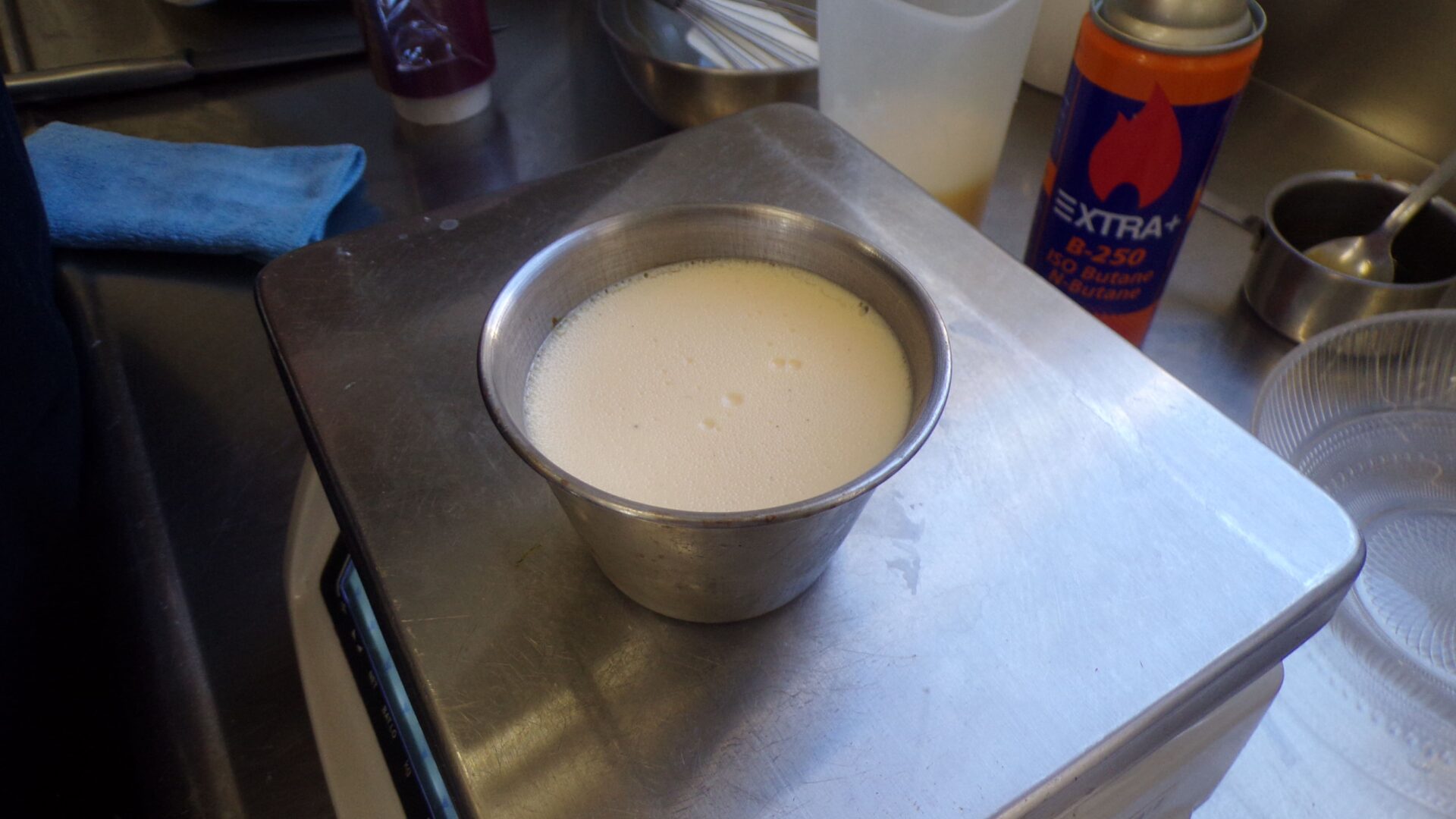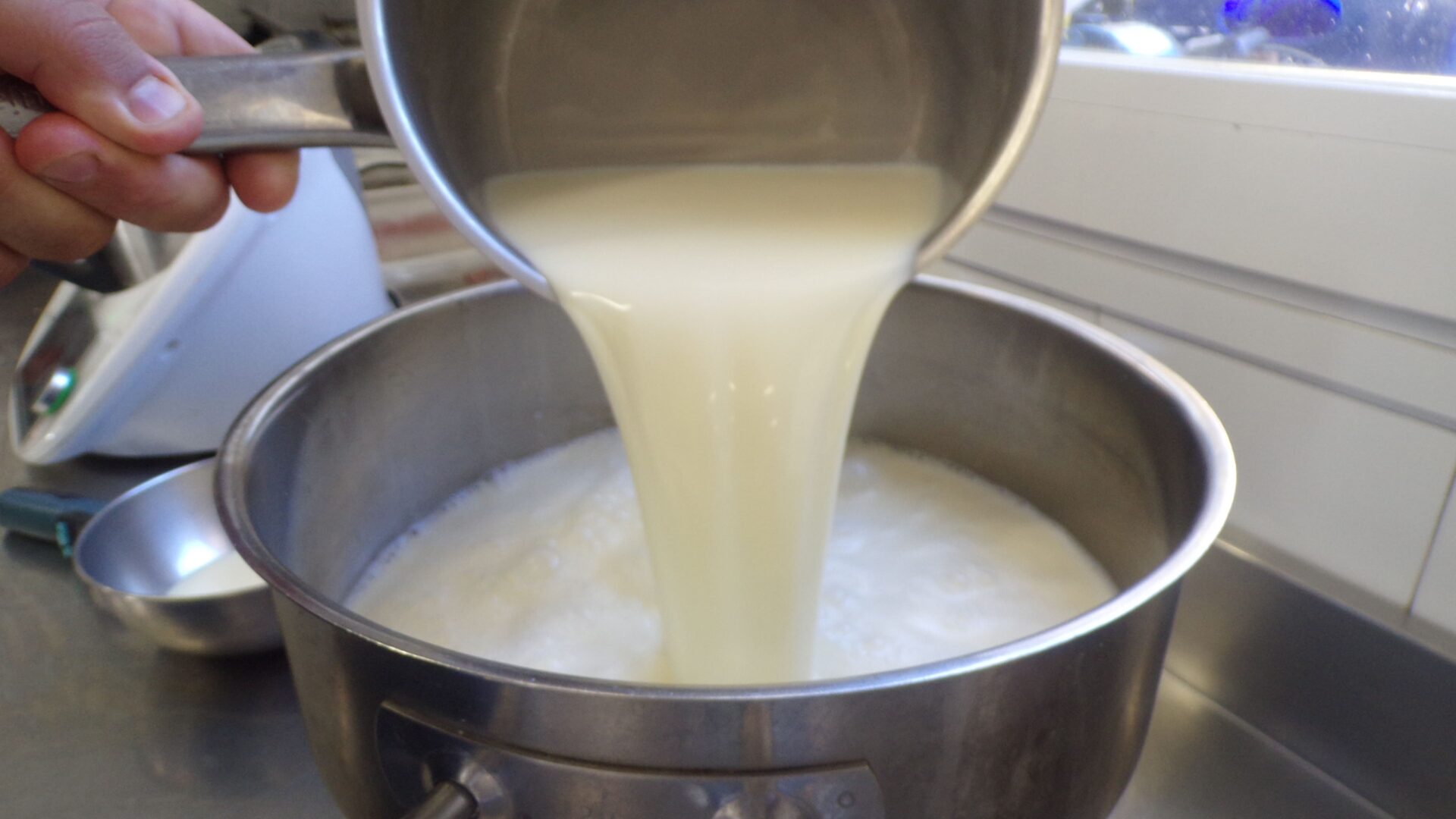 Una vez la mezcla está en la temperatura deseada, Milos comienza echa el resto de los ingredientes: el huevo, la yema y la leche condensada : “Mezclado todo, reservamos la masa. Yo la suelo colar por cualquier cosa y la dejamos reposar un mínimo de 12 horas o un día. Todo este proceso se puede llevar a la thermomix, pero aquí lo hacemos de la manera tradicional porque nos gusta así”, aclara.