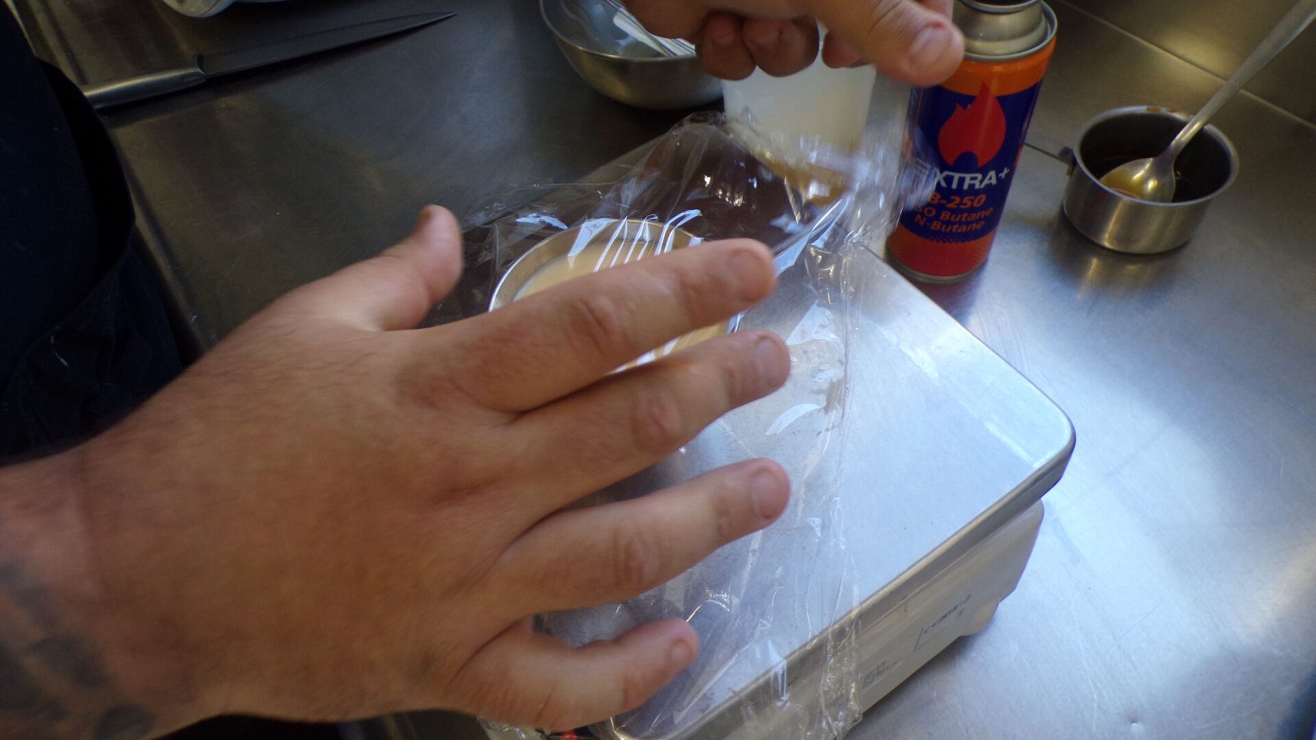 Milos empieza a montar el flan. Comienza por la base de caramelo casero elaborado por ellos: “Lo hacemos de manera tradicional, con azúcar y agua”, señala. Una vez cubierto el fondo de la flanera, Milos vierte cuidadosamente la masa del flan sin levantar el caramelo hasta casi cubrir el recipiente: “Ahora le quito las burbujas con el soplete, es un truco del chef y solo nos queda filmarlo con papel film y al horno”, asegura.