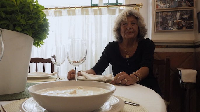 Pilar lleva bastantes años junto a Emilia y sabe perfectamente lo que se trae entre manos cuando tiene en la encimera los ingredientes. Es ella la que nos da una clase magistral sobre el gazpachuelo y nosotros la observamos atenta mientras prepara una ración que han pedido para llevar. “Ponemos el agua, las almejas, la rosada cortada en trocitos y las gambas, que es lo último que añadimos. Está el agua con las patatas cocidas y poco a poco incorporamos todo. El arroz se cuece previamente para que no se abra demasiado y la clave está en ir incorporando la mayonesa poco a poco, desliándola para que no se cuaje el guiso. Se va rectificando el punto de sal y poco más”.