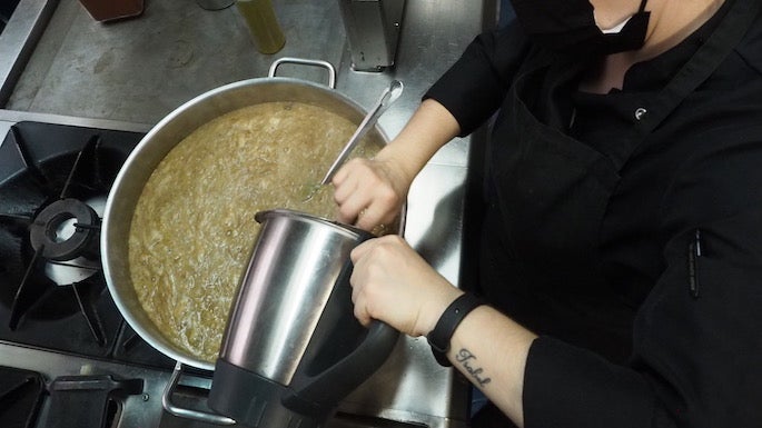Y es que, en paralelo, se va a ir preparando el sofrito que se utilizará para el guisillo . Pimientos verdes y cebolla en la sartén y, cuando están dorados, a la thermomix junto con pan que se ha frito previamente. Lo utilizan desde hace un tiempo sin gluten, de tal forma que abren el abanico de comensales que pueden disfrutar de este plato. Se tritura todo bien y se añade pimentón. El pimento que utilizan se fríe también en una sartén, cambiando de forma notable tanto la textura como el sabor y el aroma. Se transforma casi por completo. Se añade a la batidora y se da nuevamente para que mezcle bien.