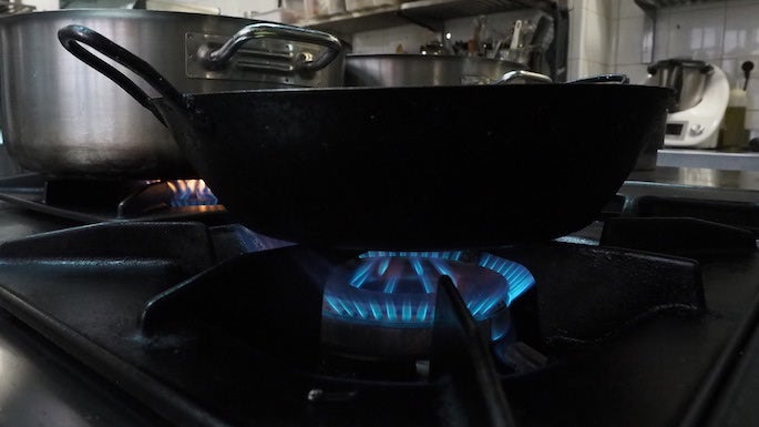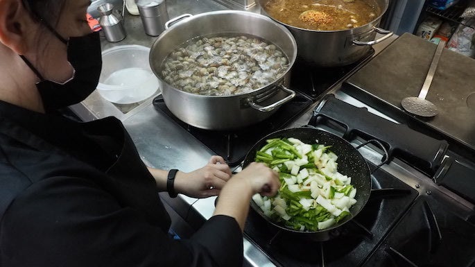 Una vez están ‘fuera’, se enciende el fuego y se los deja unos cinco o seis minutos a la lumbre para después seguir trabajando con ellos. Llegó su hora y toca seguir el proceso. Se vuelven a pasar por agua y ahora sí que emprenden su viaje final. De nuevo al fuego para ir haciéndose . A ese agua se añade a continuación la especie de salsa que se consigue con el sofrito y las especias y otros aderezos .