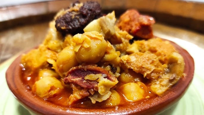 Hasta en pleno mes de agosto se ‘venden’ los callos que prepara Teresa en La Abacería de David . Se trae los garbanzos de su Setenil de las Bodegas, la localidad en la que nació. “Lechosos y buenísimos, los dejo en agua la noche anterior. Después cuezo estos por un lado y por otro los callos de ternera, que previamente los he lavado bien en agua caliente, aunque ahora suelen venir bastante limpios. Vinagre y sal para quitarle la grasa que sueltan y las impurezas que queden. Los tengo en cocción como una hora y media o así. Y lo que te comento lo hago a ojo, ¿eh? Una vez están cocidos, los dejo enfriar y los corto con tijera, mezclándolos con los garbanzos y echando el tomate, al cegbolla, el pimiento y el ajo, para luego hacer un refrito con esto. Los paso a otra cacerola, ya todo, pero con agua limpia y aceite de oliva, un puñado de sal y guindillas. Ahora se dejan cociendo y se añade el chorizo y la morcilla. Siempre a fuego lento, imprescindible. Y por último, una rama de hierbabuena, que refresca el guiso y acentúa las notas picantes. El resultado me encanta”, nos dice Teresa. A nosotros también. De hecho están entre nuestros callos favoritos en la provincia .
