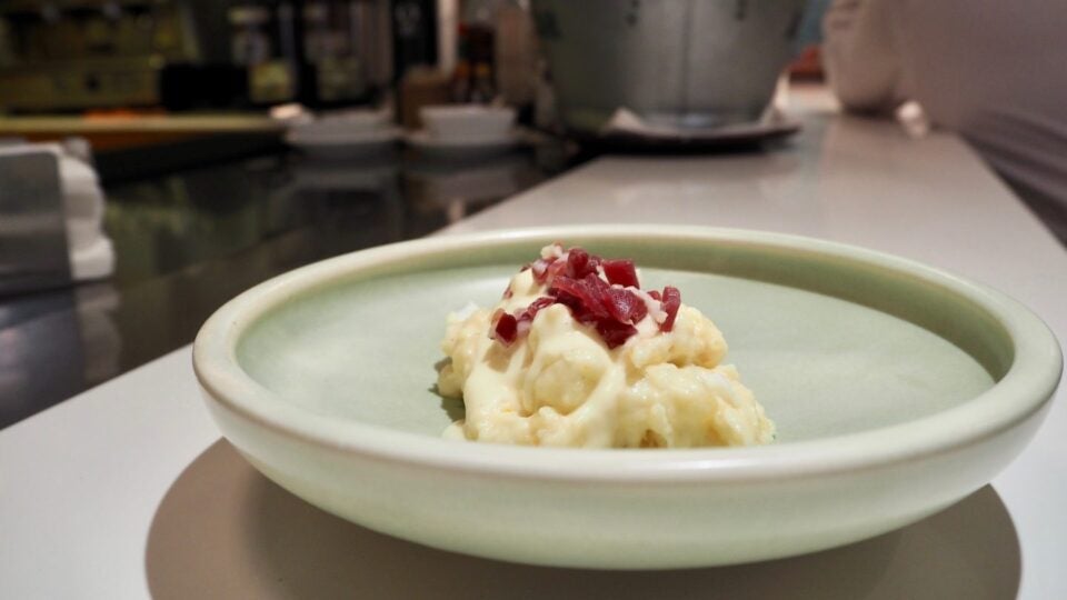 Hablar de tapeo y dejar fuera de esta –nuestra– carta a la ensaladilla rusa no tendría sentido alguno, ¿verdad? Por eso queremos incluirla y además empezar por esta elaboración, teniendo en cuenta que a ella hemos dedicado algún que otro reportaje. Entre nuestras favoritas la de Dani Carnero , la que se prepara y sirve en La Cosmopolita . La cocina con patatas cocidas templadas y le queda suave y cremosa. La corona con picadillo de jamón. Sencilla y directa. Pocas tan ricas.