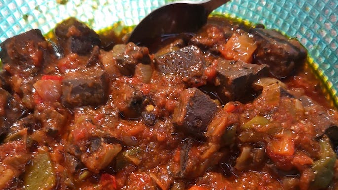 Rubén hace bastantes cosas bien en El Fiesta –¡ ese bocata de carne mechá !– y la sangre encebollada es una de ellas. La prepara como lo hace su madre, a la manera jerezana, así que le añade pimiento rojo y verde, salsa de tomate y vino de Jerez, “con su mijita de comino y de pimentón agridulce, laurel y orégano o tomillo ”. Lo tienen los fines de semana entre las sugerencias, viernes y sábado, así que anoten… ¡y prueben!