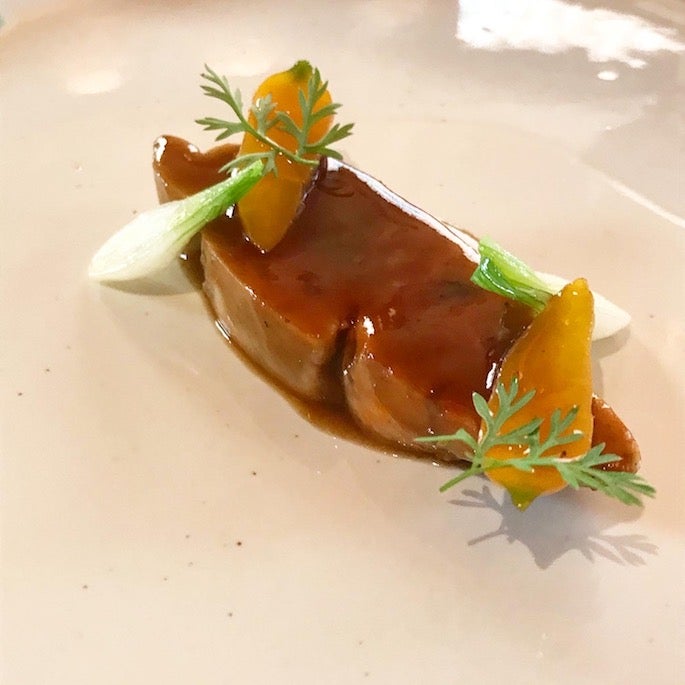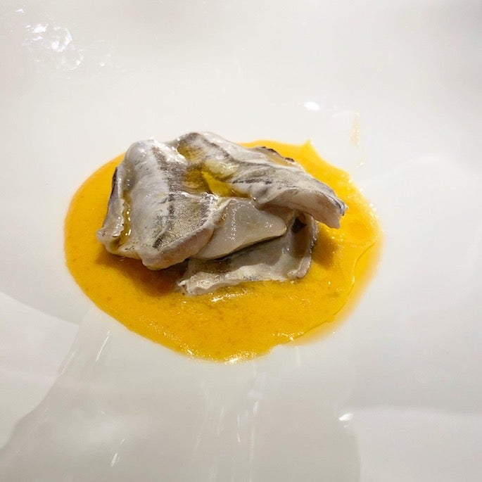 Es tremendamente complicado jugar en la cocina con la casquería marina y muy pocos se atreven con ella. Por dificultad en el producto y por público. Juanjo Carmona lo hace y de forma brillante: su escabeche de verduras, ligeramente ácido, compensa la grasa del hígado y lo encuadra en un conjunto soberbio.