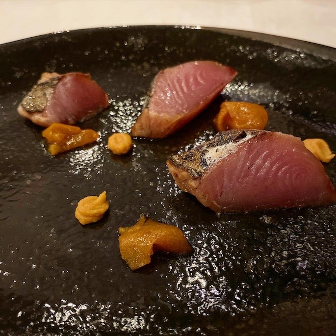 La cocina de Mauricio Giovanini sigue un camino propio y distinto. Busca armonías y equilibrios complejos como los que en este plato componen un pescado graso y terso, una mostaza punzante y un kumquat ácido y dulce. Un conjunto magistral.