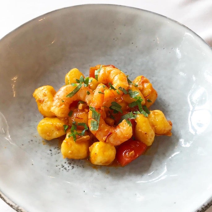 Ñoquis con gamba roja, azafrán, almendra y una americana de sus cabezas