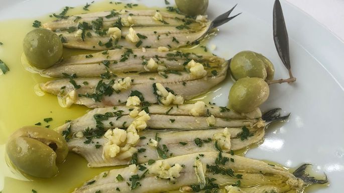 Lo cierto es que se trata de una elaboración “sencilla pero laboriosa” en la que en El Parador Playa ‘invierten’ hasta cuatro días , un paso a paso que nos detalla Francisco y del que en otra ocasión gustaremos de dar buena cuenta. Sírvale al lector de referencia que primero los boquerones se dejan reposar 24 horas “si están muy frescos, para que la carne no se pegue a las espinas demasiado”; después se limpian y desangran, sumergidos en hielo otras 24 horas “en las que se les va cambiando el agua en sucesivas ocasiones”; llega a continuación el turno al vinagre, la sal gorda y el agua, donde se sumergen uno a uno, “para que todos queden abiertos y se curen por igual”; otras 24 horas más se dejan escurrir para que pierdan el máximo de vinagre posible” y le siguen tres días “mínimo” en congelación. Se saca pasado este tiempo y se descongela en nevera dispuestos en una rejilla, para que pierda el jugo, lo que también quedara de vinagre, y se termina introduciéndolos en un recipiente con aceite de oliva virgen extra. Al servir, más AOVE –variedad picual–, ajo picado, perejil y unas aceitunas aloreñas que le ponen el contrapunto de sabor . ¡De sobresaliente!