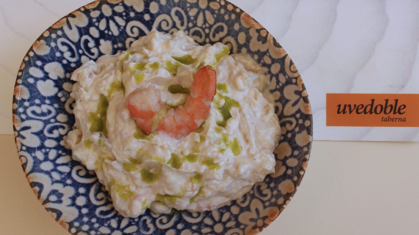 De la de Willie Orellana se podrían decir muchas cosas. Nos quedamos también con esta opción y destacamos una de las claves que compartió el cocinero y propietario de Uvedoble que está entre los secretos de su particular elaboración : “para la mayonesa utilizamos un concentrado de gambas. Con las cabezas de los langostinos se hace una americana y la reducimos. Después se añade a la mayonesa”. Las patatas se dejan al horno la noche antes y se cuecen al vapor a primera hora de la mañana. Se utilizan a temperatura ambiente. Más detalles de esta tienen en un reportaje especial que publicamos en GURMÉ Málaga con el paso a paso de la ensaladilla rusa de Uvedoble .