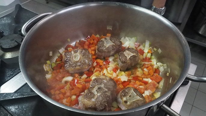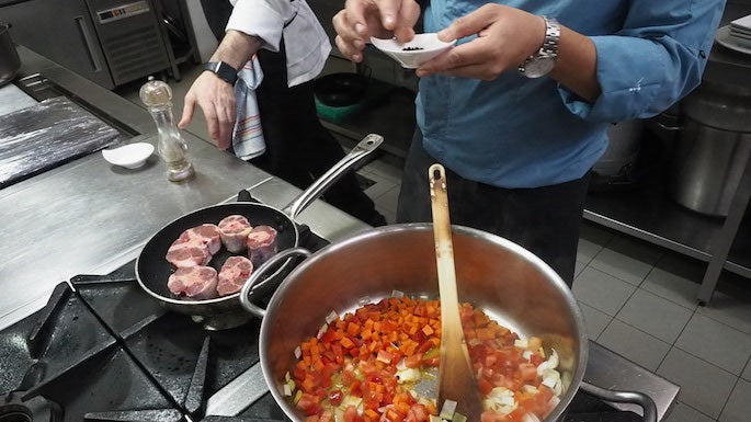 Llega el momento de ponerse a cocinar . Lo primero es preparar un sofrito con el pimiento, la zanahoria, el tomate y el puerro. “Lo preparamos el día antes, especiándolo también al punto , y la carne se deja dentro para que vaya macerándose. Se le pone un vaso de vino blanco y uno de vino tinto en ese sofrito. Es la mejor manera de que se impregne de aromas y otros sabores. El rabo de toro es una carne de matices fuertes, con personalidad, y es importante matizar en parte todo ello”, comentan Andrés y Pasquale.