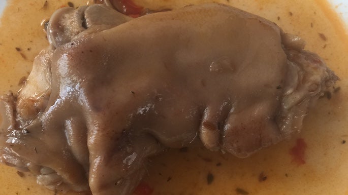 En primer lugar, chamuscar muy bien las manitas y, partiendo de agua fría, escaldar y lavar muy bien, para eliminar posibles impurezas. Introducir todos los ingredientes en una olla y cocer hasta que estén tiernas. También podemos poner la olla Express y, una vez la válvula de vapor empiece a girar, contamos unos 20 minutos. Pasado ese tiempo, dejar enfriar con la válvula puesta. ¡Y mucha precaución al abrir la olla !”