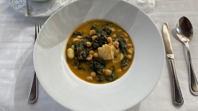 Isabelo Garrido ha querido compartir con GURMÉ un plato de temporada que gusta mucho a su clientela. Así se preparan unos garbanzos con espinacas y bacalao. Para empezar, los ingredientes serían los siguientes: garbanzos, tomate, ajo, cebolla, pimiento verde, pimentón dulce, espinacas, bacalao, huevo y agua.