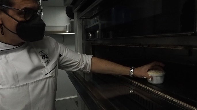Toca esperar y vamos observando cómo va tomando forma hasta que escuchamos el sonido de que está listo para sacarlo del horno. De ahí al plato, para montar este postre con helado de vainilla y una crema inglesa que el servicio de sala se ocupa de verter en el soufflé, como hemos mostrado en un vídeo compartido en redes sociales. Se abre por el centro y se deja caer la crema para que llegue el momento esperado… ¡Buen provecho!