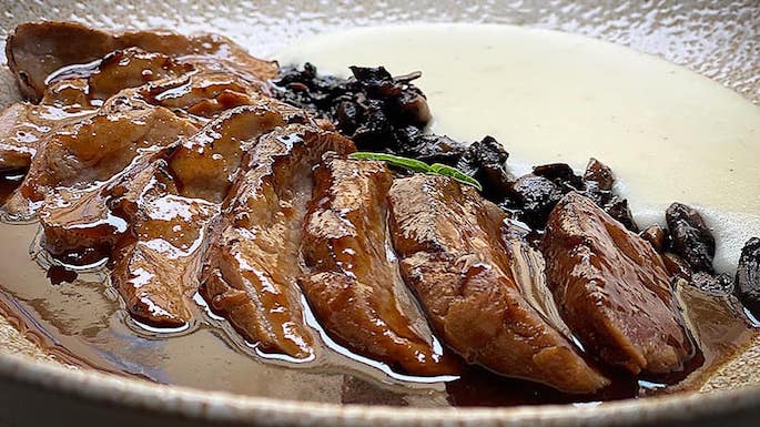 ‘Saliendo uno de nuestros pedidos de este domingo, una ración de callos de ternera y pochas con boletus y perdiz’. Así se las gastan en La Casería. Jacobo Vázquez apuesta por seguir en su cocina y lo incluimos en esta lista para tenerlo en cuenta.