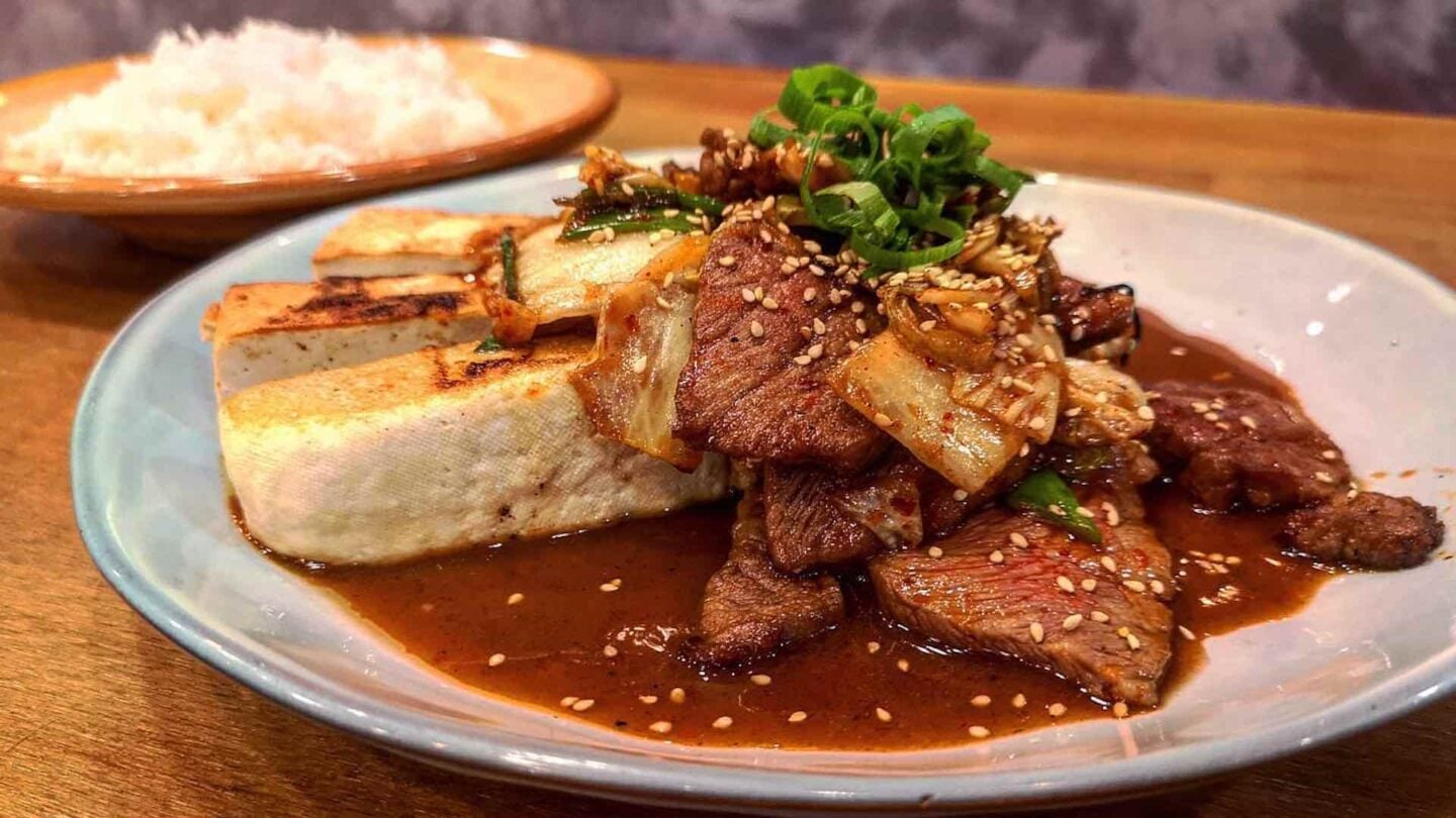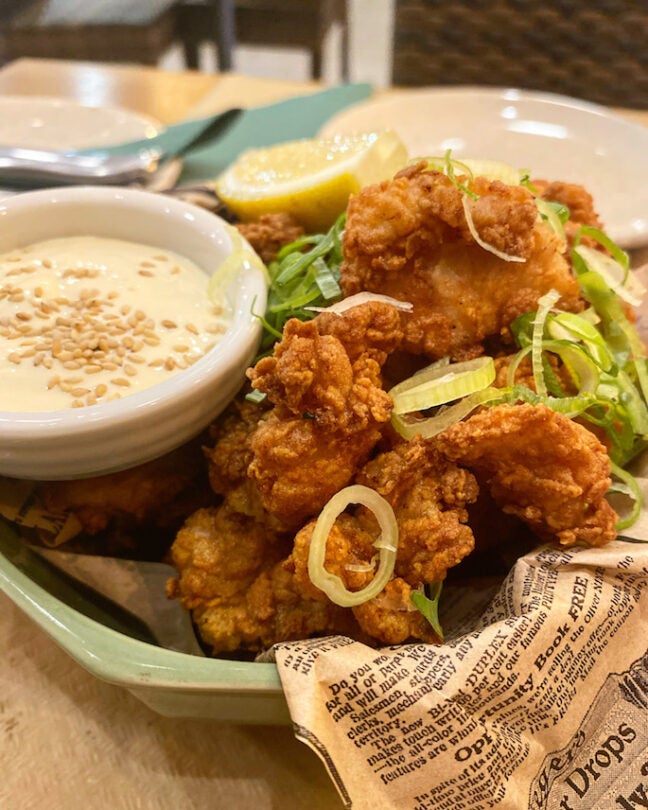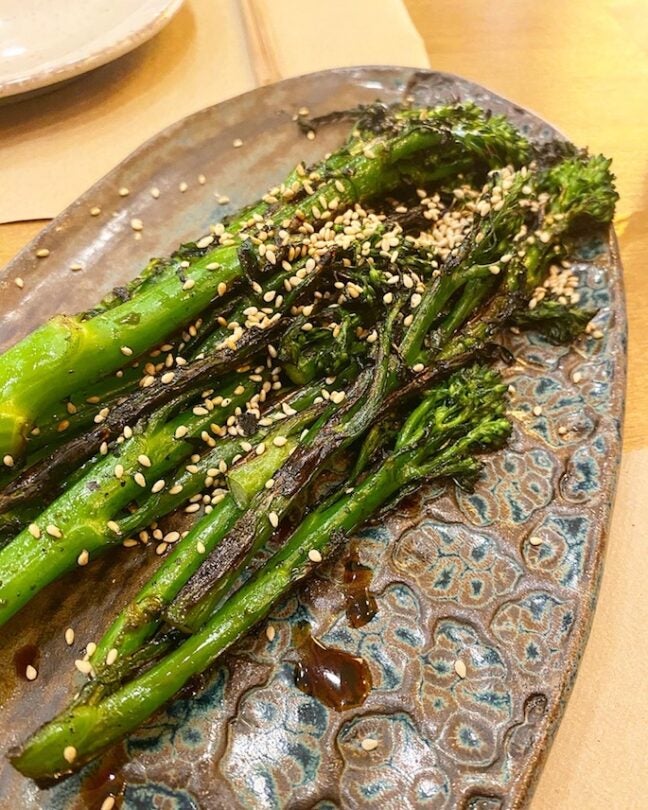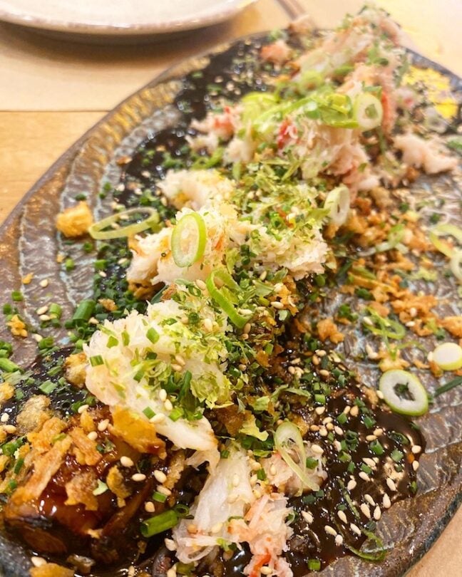 En la mesa encontramos platos desenfadados, sabrosos y contundentes que mezclan distintas técnicas y orígenes. Yakitoris –brochetas– de gambones y kosho de jalapeños, de pollo de corral con teriyaki de sirope de arce o el de presa ibérica y salsa yakiniku , estupendo. También aperitivos clásicos como el pollo karaage –pollo frito– con alioli de karashi y rábano picante o el okonomiyaki de cangrejo de las nieves, aguacate y mayonesa de wasabi y mucha verdura , como el sabroso bimi a la parrilla con un glaseado de soja, yuzu y sésamo tostado o las judías verdes a la brasa con salsa de sésamo y cacahuete . Entre los principales, platos más rotundos, ideales para ser compartidos, como las costillas de cerdo glaseadas a la parrilla o el interesante puerro al carbón con salsa de chili crab y cangrejo . Conjuntos que por lo general funcionan aunque, por momentos, se superpongan algunas salsas, marinadas y aliños y creen cierta confusión en algún plato.