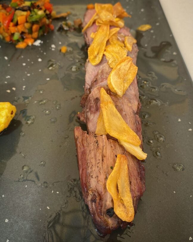 Entre los pescados destacan el bacalao o la merluza, trabajados a la sartén, con salsas bien trabadas y sofritos llenos de sabor. Las carnes, ejecutadas con sabiduría en las brasas, son su punto fuerte. No falla el solomillo ibérico, regado con una ajada al salir de la parrilla o el chateaubriand con salsa bearnesa. Ambos de obligado cumplimiento. Deliciosos.