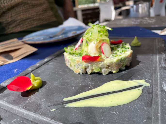 También se colaron en nuestro menú una tradicional ensaladilla con gambas y ventresca de atún y para abrir boca una tapita de huevas y mahonesa . Nos alegró encontrarla en la mesa recordándome esos aperitivos que de niña solían prepararse en casa y en los que las huevas cobraban un papel protagonista ya fuesen en ensaladilla o así, como Álvaro las presenta, sin florituras ni excesos. ¡Qué bonito es cuando la cocina nos hace viajar en el mundo de los recuerdos!