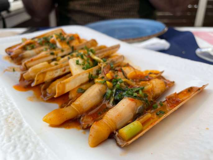 Merece la pena probar las navajas con mantequilla de kimchee y hierbas , que fueron nuestro plato más celebrado. El molusco tocó el fuego lo necesario para abrirse y soltar sus jugos de intenso sabor a mar, realzados por la salsa que forman junto con la mantequilla. Una maravilla. Muy logradas también las cocochas de bacalao fritas con tuétano asado y mahonesa de hierbas , un plato arriesgado y de sabor potente en el que hay que ir con cuidado en los puntos de sal, pero en el que un leve toque de mahonesa suaviza la intensidad presentándose como un conjunto muy agradable.