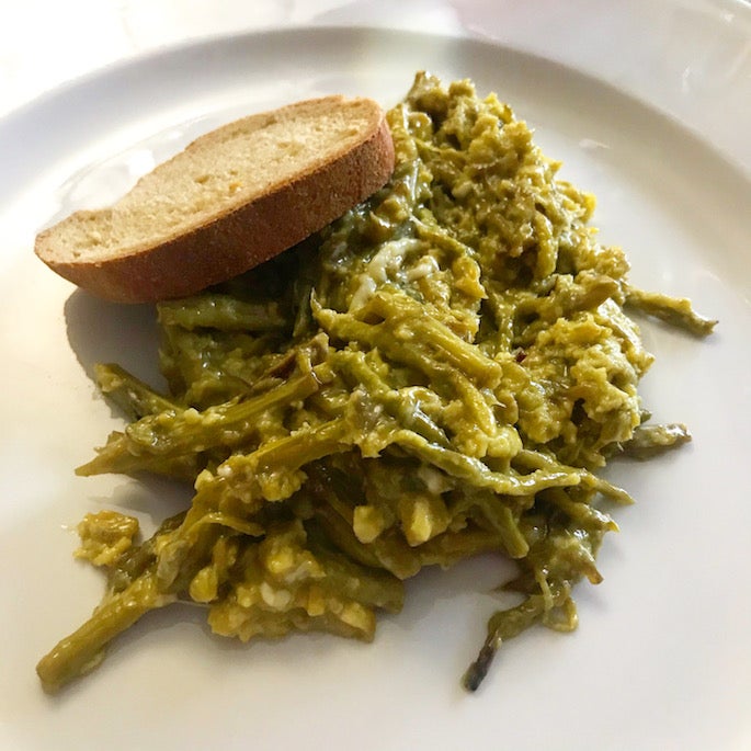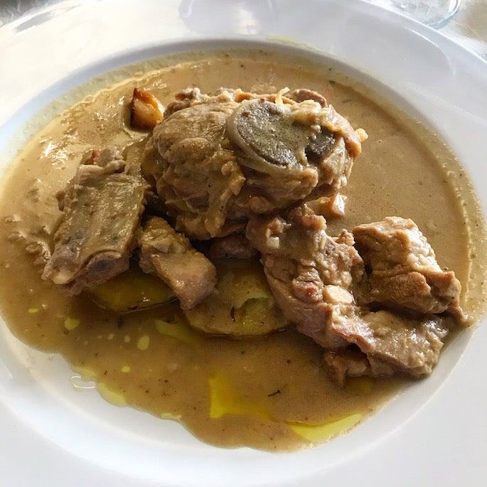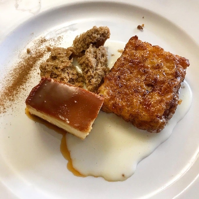 Sentados a su mesa se hace imprescindible comenzar con su lomo en manteca , extraordinario, “hors categorie”. Sin embargo –y a pesar de su fama– decepcionan un tanto las migas .Por esta zona se suelen hacer con se?mola y se adornan con granada o naranja –nada que objetar– pero en conjunto resultan algo sosas. Magníficos también los espa?rragos silvestres con huevos de corral . Trigueros de verdad, con ese aroma a campo y ese amargor tan característico y un irreprochable revuelto bien cocinado, jugoso y hu?medo.