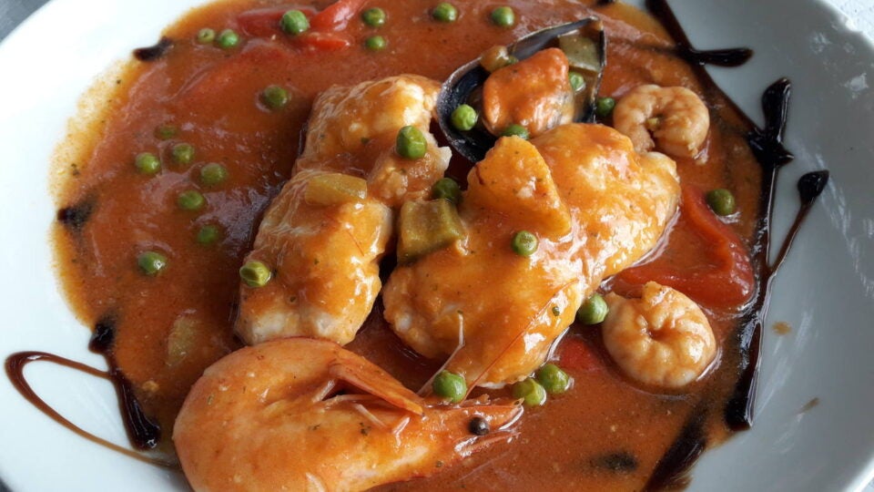Albóndigas de rape y langostinos con almejas en salsa verde