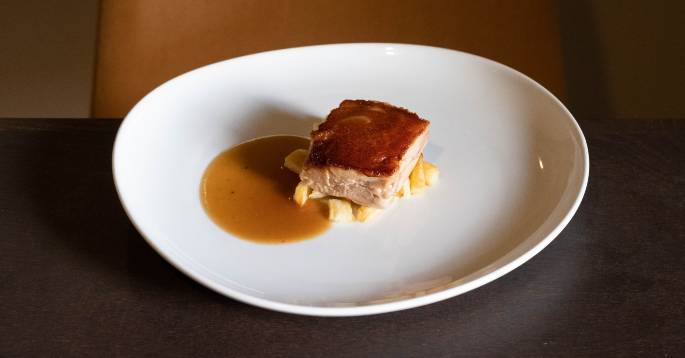 Hay carnes como cochinillo, presa ibérica de bellota País de Quercus a la brasa con setas a la crema o rib eye premium de vaca simmental. También hay pescados como lubina salvaje con jugo de menudo de ternera.