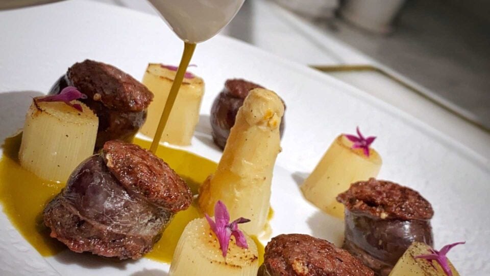 Para empezar tienen una selección de ibéricos y recetas como aguacate templado, tartar de tomate y espuma de queso, molleja confitada y braseada con zanahorias encominadas y limón quemado o cebolla asada rellena de paté de ave al PX.