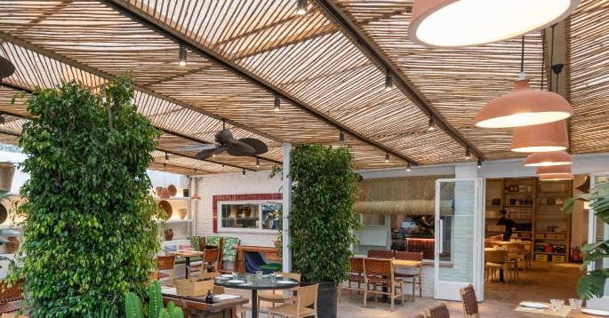 Consta de una gran terraza con espacio suficiente para espaciar las mesas cumpliendo con las directrices actuales. El interior es amplio y luminoso, con una decoración rústica y acogedora.