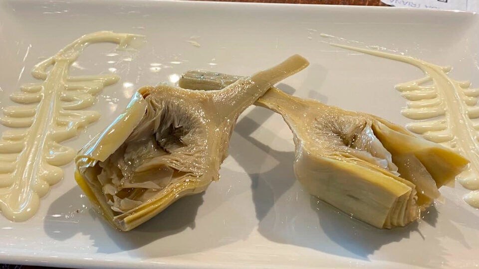 Barrabar’s propone unas alcachofas para dar la bienvenida al verano. Las marinan en aceite de girasol, vinagre de vino, sal, ajo, perejil, albahaca y menta y las sirven cortadas por la mitad acompañadas de una mayonesa de vino Lustau.