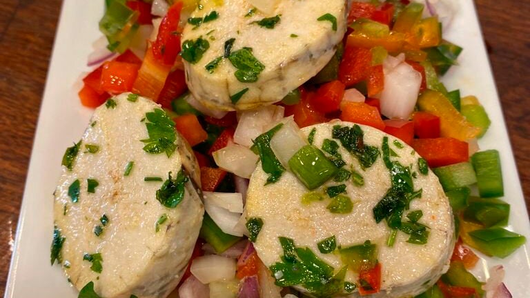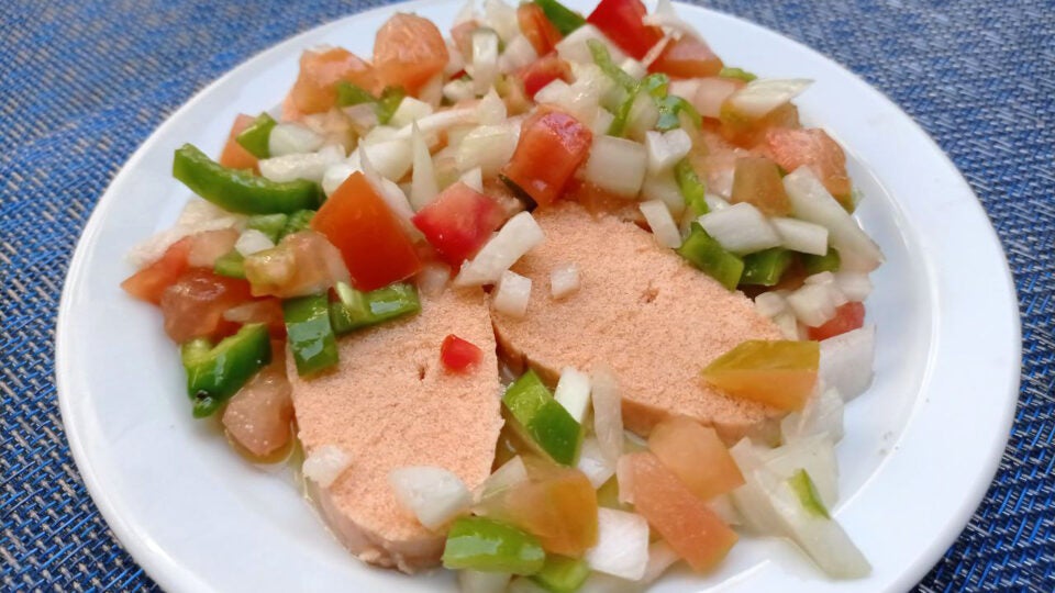 En El Paseíllo utilizan huevas de merluza fresca que ellos mismos limpian, cortan y cuecen y acompañan de un picadillo de pimiento rojo, verde, cebolla morada y blanca y un aliñan con aceite de oliva virgen extra, vinagre de sidra, sal y pimienta negra.