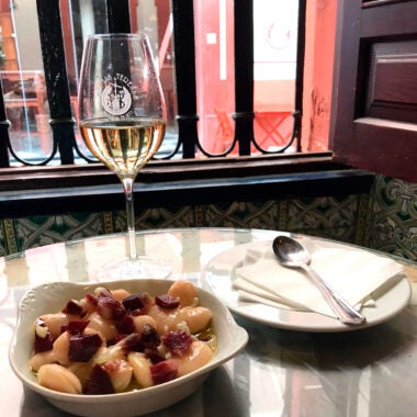 Es uno de los lugares emblemáticos del barrio de Santa Cruz. En las Teresas sirven este particular aliño para el que utilizan judiones de Navarra aliñados con AOVE, vinagre de solera de Jerez de 25 años y sal y los acompañan de un toque de cebolleta fresca y taquitos de jamón de bellota 100% ibérico.