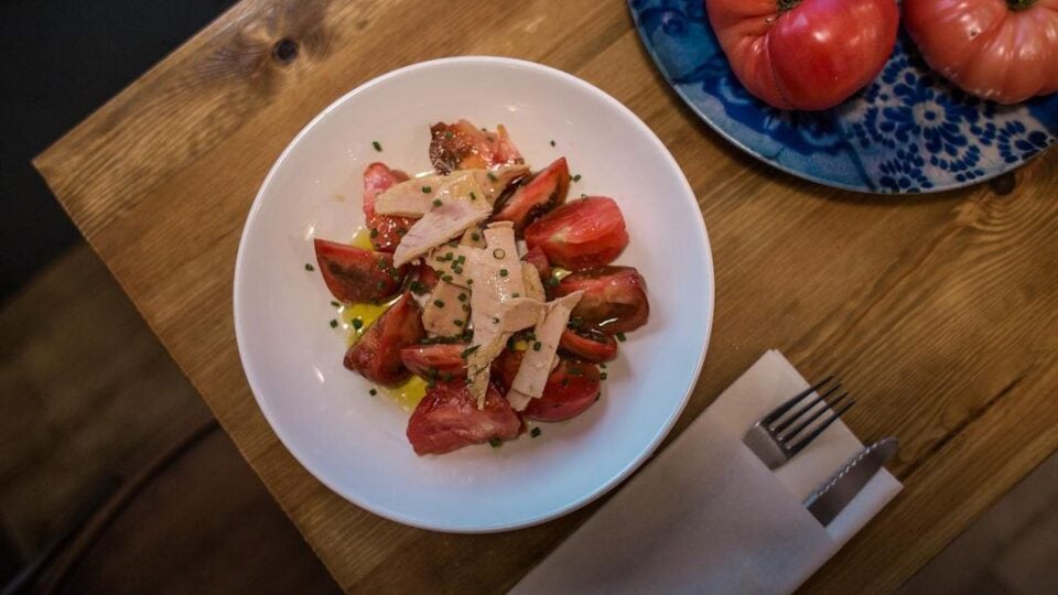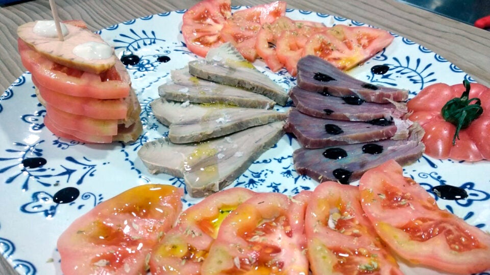 En Bodeguita Maridaje disfrutan del verano y la temporada del atún con su Tumátum . La base del plato, a diferencia de su tomate aliñado para el que utilizan tomate de Los Palacios, para este usan la variedad rosa o la corazón de buey. Según cuentan a GURMÉ, es una forma muy fresquita de degustar las diferentes variedades y cortes de atún: hueva cocida de atún rojo (que acompañan con mayonesa de soja) , lomo mechado y lomo salado (que se asemeja a la mojama). El tomate lo aliñan con orégano fresco que reciben a diario de una huerta cercana, vinagre de yema de Jerez y aceite de oliva virgen.