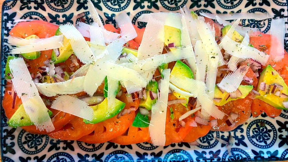 Gastan una mojama de atún de Isla Cristina, que cortan en lonchas y luego esas lonchas a la mitad. Va al plato con cebolla muy picadita, perejil y se riega con aceite de calidad.