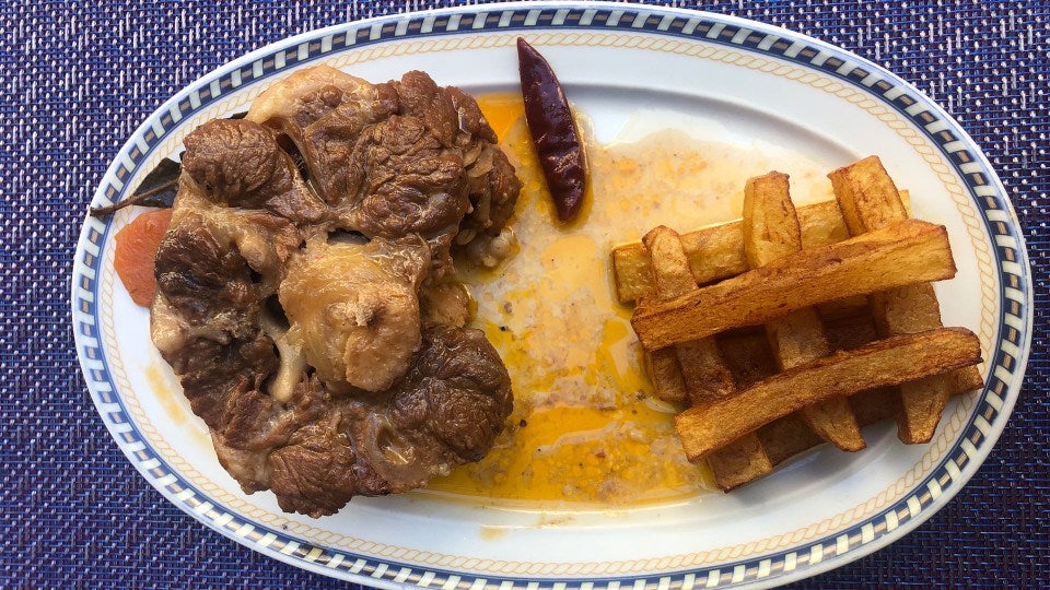 En Sabina la sirven deshuesada y regada con el fondo sobre un lecho de patatas. Nada de ollas a presión: dos horas a fuego lento para darle una textura jugosa , que des desmenuza solo con acercarle el tenedor.