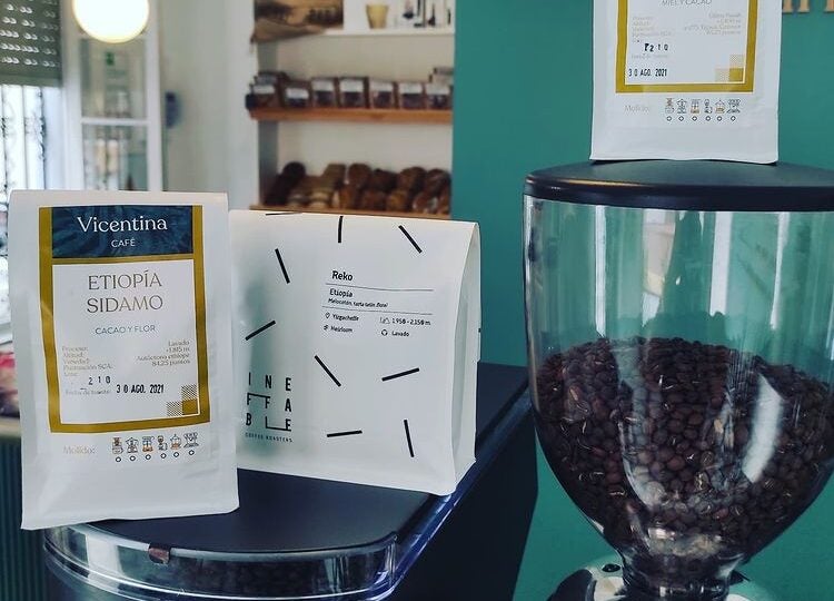 En Kanimo los cafés, los tuestan ellos mismos en Badajoz y los importan de procedencias tan diversas como Colombia, Etiopía, México o Ruanda. Los empaquetan directamente en grano, puesto que lo ideal es molerlo justo antes de consumirlo, y ofrecen la opción de llevar a casa, en grano o molido por ellos .