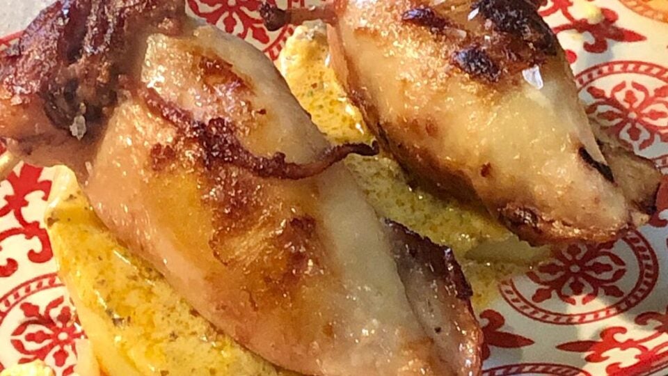 Este chipirón ibérico está relleno de gambas de Huelva y panceta ibérica de bellota de Corte Concepción, con lo que ofrecen una sorprendente simbiosis de mar y montaña. Una vez relleno se hace a la plancha y se presenta con una rodaja de patata cocida templada y una salsa café París que da jugosidad a la patata. En un principio la receta estuvo rellena de bacon pero después lo cambiaron por la panceta que es un producto más español.