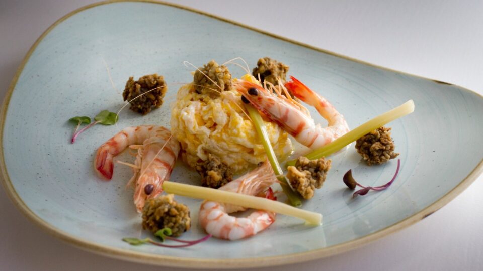 Revuelto de ortiguillas con langostinos a la brasa de Casa Rafel