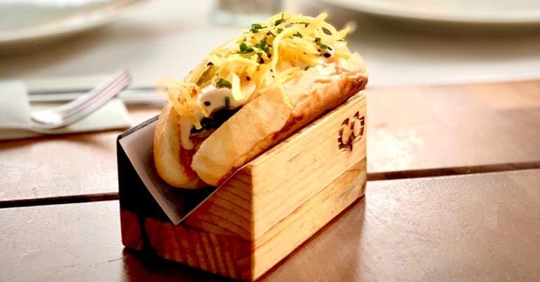 Se trata de un brioche de mejillones en escabeche con guacamole y hierbabuena que se acompaña de filamentos de patatas fritas naturales. Se adereza con una mayonesa del escabeche de los mejillones.