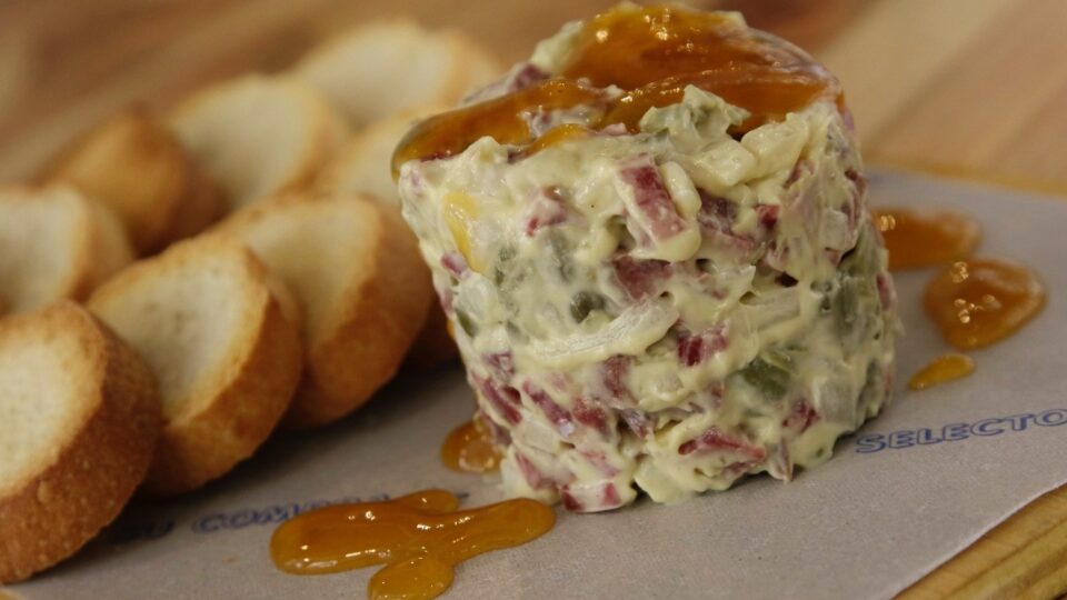 Este tartar sintetiza el concepto gastronómico de esta abacería, con una base de salchichón ibérico que resume su apuesta por las chacinas. El guiño a los vinos de Jerez que lleva la receta es otro de los puntos claves del establecimiento, donde hay una gran variedad de estos caldos. Mermelada de albaricoque y amontillado dan el toque final a la propuesta.