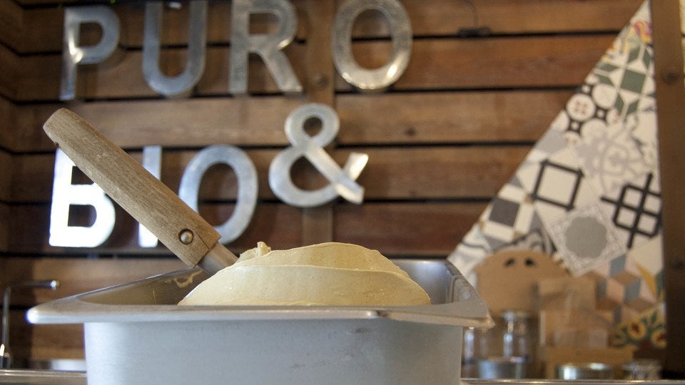 Puro lleva años apostando por un amplio catálogo de productos bio con los que poner una nota dulce a cualquier momento del día. Lo característico de estos helados es que están hechos en el mismo día, si se trata de fin de semana incluso se hacen varias veces durante la jornada, con el objetivo de que el resultado final sea cremoso y lleno de sabor sin perder su textura original. Al no llevar colorantes ni potenciadores, los sabores vienen determinados por las frutas y los frutos secos que se emplean en su elaboración, materia prima de primera calidad, como los pistachos ecológicos de Sicilia o el azúcar de caña ecológica de Brasil. También cuentan con obrador bio donde elaboran desde tartas hasta galletas y repostería, piezas que se pueden acompañar de café de alta gama.