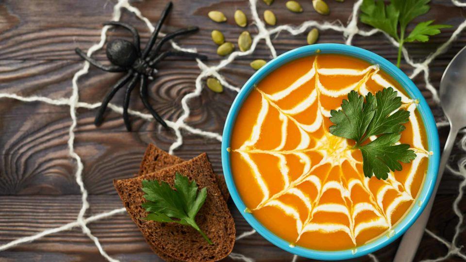 Se cocina durante unos minutos y se cubre con el caldo de verduras para, a continuación, cocer durante treinta minutos. Pasado el tiempo, se tritura con una batidora y se pasa por el chino para conseguir una crema fina. Listo, ahora puedes aprovechar el queso para fundirlo y crear una tela de araña. Además, puedes aprovechar la calabaza hueca para decorar tu casa.