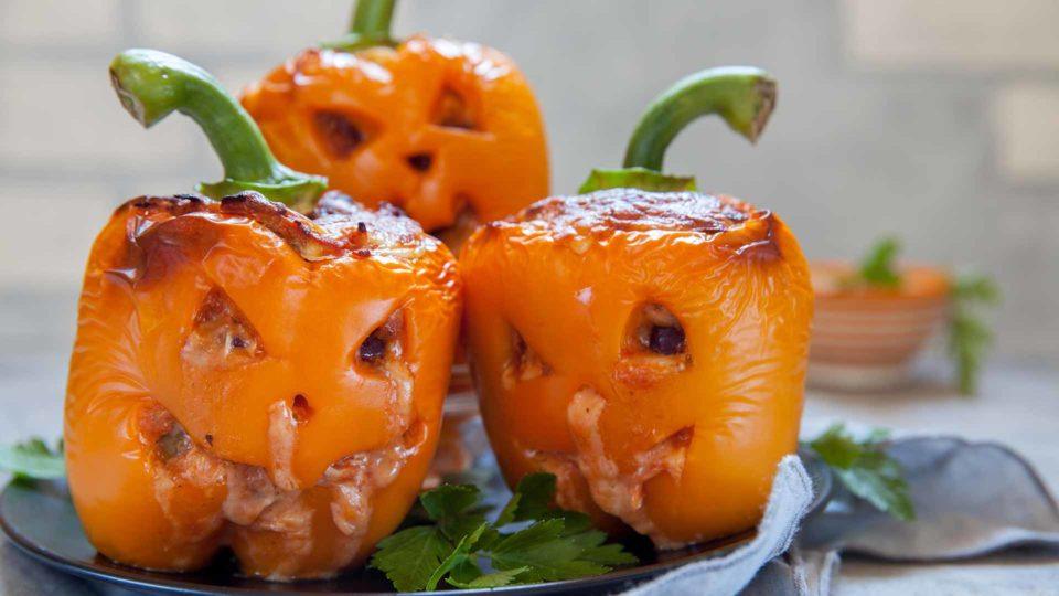 Toca trabajar con los pimientos. Se les corta la parte de arriba, se lavan bien y, con una puntilla, se dibujan los ojos y la boca. Se secan con papel, se rellenan con la carne preparada y se meten en el horno a 200 grados durante alrededor de 35 minutos. ¡Listos para servir!