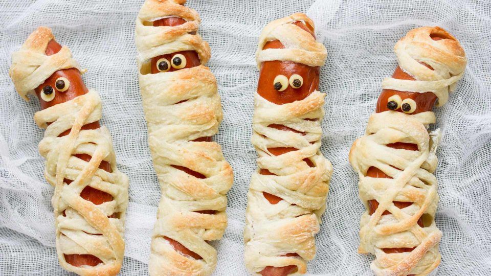 Tras la crema de calabaza, una receta fácil que encantará a los niños son las momias de salchichas . Los ingredientes necesarios son masa de hojaldre, salchichas frankfurt y ketchup. Para empezar, se corta el hojaldre en finas tiras de alrededor de medio centímetro y, con las mismas, se enrollan cada una de las salchichas, dejando un espacio para colocar los ojos. Las «momias» se llevan al horno para cocinarlas a 180 grados durante 20 minutos. Para recrear los ojos, puedes hacer uso de ketchup, aplicado con una jeringa, o bien con salsa barbacoa. También hay quien opta por tiras finas de dientes de ajo en conserva con una semilla de sésamo negro en el centro o, también, dos puntos de mostaza.